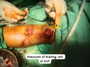 A patient presented with a painful, bulging mass at the site of a matured AV fistula, raising suspicion of aneurysmal changes. On surgical exploration, a significant aneurysm of the draining vein was identified, along with organized thrombus.