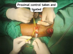 Proximal control and ligation of the feeding vessel, evacuation of thrombus from the aneurysmal segment, and repair of the aneurysm wall to preserve surrounding structures and maintain hemodynamic safety.